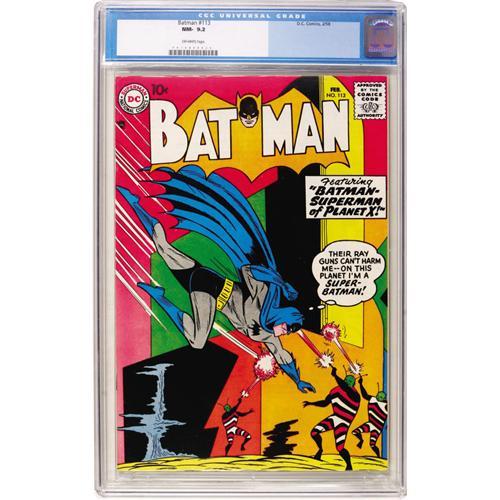 <B>Batman #113 (DC, 1958) CGC NM- 9.2 Off-white pages. </B></I> The first appearance of Fatman weighs heavy on Batman as he meets his Planet X counterpart in this issue. Overstreet 2006 NM- 9.2 value = $475. CGC census 3/07: 2 in 9.2, none higher.<BR><BR><b>Shipping:</b> Comics - Slabbed (certified) (<a target="_blank" href="http://www.heritageauctions.com/common/shipping.php">view shipping information</a>)