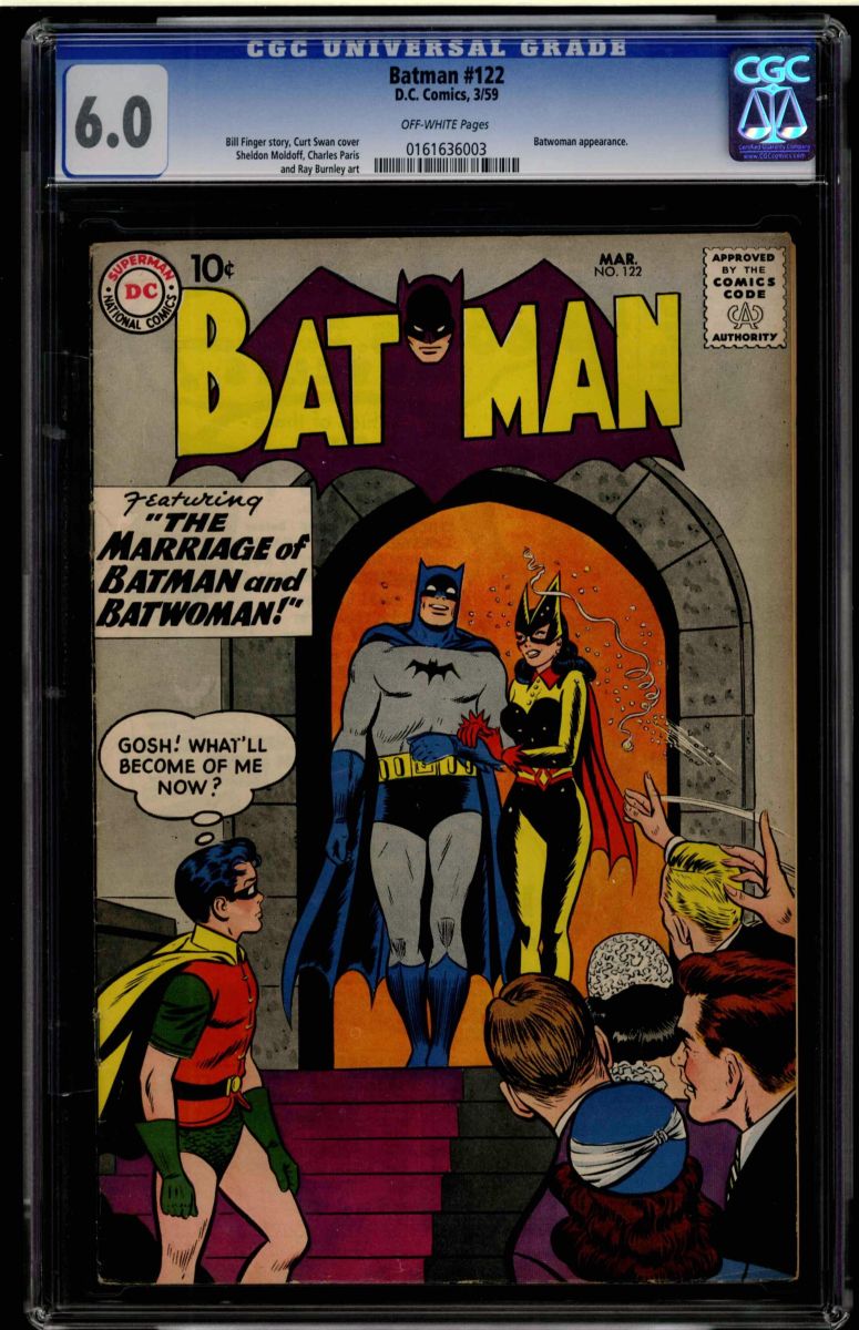 Batman #122 CGC 6.0 off-white pages. Bill Finger story Curt Swan cover, Sheldon Moldoff Charles Paris, and Ray Burnley art. Batwoman appearance. Overstreet 2009 FN 6.0 value = $111. CGC census: 2 at 6.0, 14 higher.