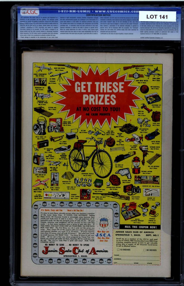The Auctioneer has reserved the right to reject any and all bids, and to bid at the auction. Auctioneers Auctions are not on approval. Auctioneer does not allow certified material to be returned because of possible differences of opinion with respect to the grade offered by any third party organization, dealer, or service. Absolutely no guarantee of grade is offered for un-certified property sold and subsequently submitted to a third-party grading service. There will be no exceptions to this policy. Under extremely limited circumstances, (e.g. gross cataloging error) a purchaser, who did not bid from the floor, may request Auctioneer to evaluate voiding a sale; such request must be made in writing detailing the alleged gross error, and submission of the lot to the Auctioneer must be pre-approved by the Auctioneer. Bidder must notify Auctioneer in writing of such request within three (3) days of the non-floor bidder receipt of the lot. Any lot that is to be evaluated must be in our offices within 30 days after Auction. Grading does not qualify for this evaluation process nor do such complaints constitute a basis to challenge the authenticity of a lot. AFTER THAT 30-DAY PERIOD, NO LOTS MAY BE RETURNED FOR REASONS OTHER THAN AUTHENTICITY. Lots returned must be housed intact in the original holder. No lots purchased by floor Bidders may be returned (including those Bidders acting as agents for others). Late remittance for purchases may be considered just cause to revoke all return privileges. B: Auctions conducted solely on the Internet have a THREE (3) DAY RETURN POLICY: Lots paid for within seven days of the Auction closing are sold with a three (3) day return privilege. You may return lots under the following conditions: Within three days of receipt of the lot, you must first notify Auctioneer by contacting Client Service by phone (314-680-8599) or e-mail (moundcityauctions@gmail.com), and immediately mail the lot(s) fully insured to the attention of Returns, Mound City Auctions 1081 Teson Rd. Hazelwood, MO. 63042. Lots must be housed intact in their original holder and in their original condition. You are responsible for the insured, safe delivery of any lots. Auctioneer will not be responsible for lots returned in non-registered mail or lots returned without prior authorization per section B. A non-negotiable return fee of 5% of the purchase price ($10 per lot minimum) will be deducted from the refund for each returned lot or billed directly. Postage and handling fees are not refunded. After the three-day period (from receipt), no items may be returned for any reason. Late remittance for purchases revokes all Return-Restock privileges. C: Bidders who have inspected the lots prior to the auction will not be granted any return privileges. D: Comic books sold referencing a third-party grading service are sold “as is” without any express or implied warranty. Certain warranties may be available from the grading services and the Bidder is referred to them for further details: Certified Guaranty Company, LLC. (CGC), P.O. Box 4738, Sarasota, FL 34230. E: Bidders who intend to challenge authenticity or provenance of a lot must notify Auctioneer in writing within thirty (30) days of the Auctions conclusion. In the event Auctioneer cannot deliver the lot or subsequently it is established that the lot lacks title, provenance, authenticity, or other transfer or condition issue is claimed, Auctioneer's liability shall be limited to rescission of sale and refund of purchase price; in no case shall Auctioneer's maximum liability exceed the high bid on that lot, which bid shall be deemed for all purposes the value of the lot. After one year has elapsed, Auctioneer's maximum liability shall be limited to any commissions and fees Auctioneer earned on that lot. F: All comics are guaranteed genuine, but are not guaranteed as to grade, since grading is a matter of opinion, an art and not a science, and therefore the opinion rendered by the Auctioneer or any third party grading service may not agree with the opinion of others (including trained experts), and the same expert may not grade the same item with the same grade at two different times. G: Since we cannot examine encapsulated comics, they are sold “as is”without our grading opinion, and may not be returned for any reason. Auctioneer shall not be liable for any patent or latent defect or controversy pertaining to or arising from any encapsulated collectible. In any such instance, purchaser's remedy, if any, shall be solely against the service certifying the collectible. H: Due to changing grading standards over time, differing interpretations, and to possible mishandling of items by subsequent owners, Auctioneer reserves the right to grade items differently than shown on certificates from any grading service that accompany the items. Auctioneer also reserves the right to grade items differently than the grades shown in the prior catalog should such items be reconsigned to any future auction. I: Although consensus grading is employed by most grading services, it should be noted as aforesaid that grading is not an exact science. In fact, it is entirely possible that if a lot is broken out of a plastic holder and resubmitted to another grading service or even to the same service, the lot could come back with a different grade assigned. J: Certification does not guarantee protection against the normal risks associated with potentially volatile markets. The degree of liquidity for certified collectibles will vary according to general market conditions and the particular lot involved. For some lots there may be no active market at all at certain points in time."