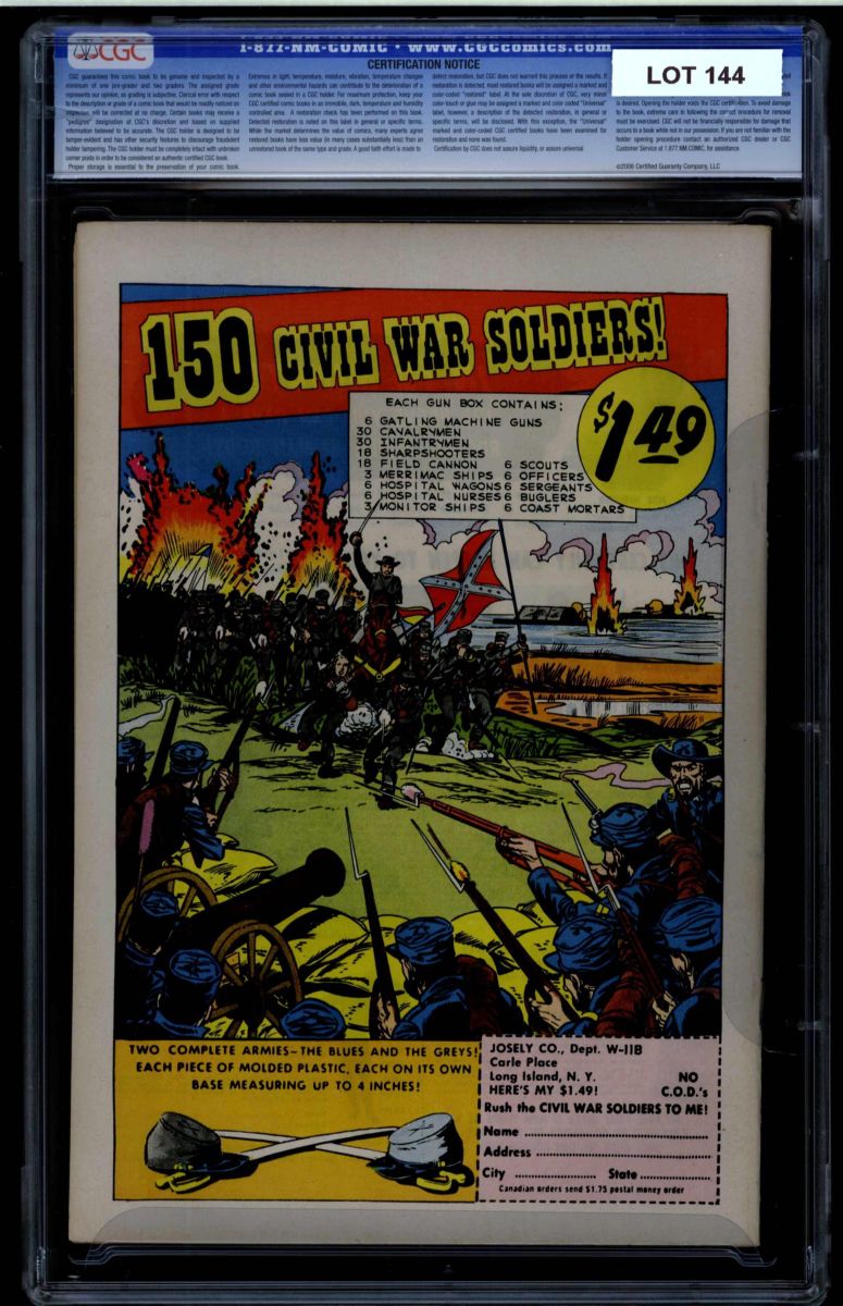 The Auctioneer has reserved the right to reject any and all bids, and to bid at the auction. Auctioneers Auctions are not on approval. Auctioneer does not allow certified material to be returned because of possible differences of opinion with respect to the grade offered by any third party organization, dealer, or service. Absolutely no guarantee of grade is offered for un-certified property sold and subsequently submitted to a third-party grading service. There will be no exceptions to this policy. Under extremely limited circumstances, (e.g. gross cataloging error) a purchaser, who did not bid from the floor, may request Auctioneer to evaluate voiding a sale; such request must be made in writing detailing the alleged gross error, and submission of the lot to the Auctioneer must be pre-approved by the Auctioneer. Bidder must notify Auctioneer in writing of such request within three (3) days of the non-floor bidder receipt of the lot. Any lot that is to be evaluated must be in our offices within 30 days after Auction. Grading does not qualify for this evaluation process nor do such complaints constitute a basis to challenge the authenticity of a lot. AFTER THAT 30-DAY PERIOD, NO LOTS MAY BE RETURNED FOR REASONS OTHER THAN AUTHENTICITY. Lots returned must be housed intact in the original holder. No lots purchased by floor Bidders may be returned (including those Bidders acting as agents for others). Late remittance for purchases may be considered just cause to revoke all return privileges. B: Auctions conducted solely on the Internet have a THREE (3) DAY RETURN POLICY: Lots paid for within seven days of the Auction closing are sold with a three (3) day return privilege. You may return lots under the following conditions: Within three days of receipt of the lot, you must first notify Auctioneer by contacting Client Service by phone (314-680-8599) or e-mail (moundcityauctions@gmail.com), and immediately mail the lot(s) fully insured to the attention of Returns, Mound City Auctions 1081 Teson Rd. Hazelwood, MO. 63042. Lots must be housed intact in their original holder and in their original condition. You are responsible for the insured, safe delivery of any lots. Auctioneer will not be responsible for lots returned in non-registered mail or lots returned without prior authorization per section B. A non-negotiable return fee of 5% of the purchase price ($10 per lot minimum) will be deducted from the refund for each returned lot or billed directly. Postage and handling fees are not refunded. After the three-day period (from receipt), no items may be returned for any reason. Late remittance for purchases revokes all Return-Restock privileges. C: Bidders who have inspected the lots prior to the auction will not be granted any return privileges. D: Comic books sold referencing a third-party grading service are sold “as is” without any express or implied warranty. Certain warranties may be available from the grading services and the Bidder is referred to them for further details: Certified Guaranty Company, LLC. (CGC), P.O. Box 4738, Sarasota, FL 34230. E: Bidders who intend to challenge authenticity or provenance of a lot must notify Auctioneer in writing within thirty (30) days of the Auctions conclusion. In the event Auctioneer cannot deliver the lot or subsequently it is established that the lot lacks title, provenance, authenticity, or other transfer or condition issue is claimed, Auctioneer's liability shall be limited to rescission of sale and refund of purchase price; in no case shall Auctioneer's maximum liability exceed the high bid on that lot, which bid shall be deemed for all purposes the value of the lot. After one year has elapsed, Auctioneer's maximum liability shall be limited to any commissions and fees Auctioneer earned on that lot. F: All comics are guaranteed genuine, but are not guaranteed as to grade, since grading is a matter of opinion, an art and not a science, and therefore the opinion rendered by the Auctioneer or any third party grading service may not agree with the opinion of others (including trained experts), and the same expert may not grade the same item with the same grade at two different times. G: Since we cannot examine encapsulated comics, they are sold “as is”without our grading opinion, and may not be returned for any reason. Auctioneer shall not be liable for any patent or latent defect or controversy pertaining to or arising from any encapsulated collectible. In any such instance, purchaser's remedy, if any, shall be solely against the service certifying the collectible. H: Due to changing grading standards over time, differing interpretations, and to possible mishandling of items by subsequent owners, Auctioneer reserves the right to grade items differently than shown on certificates from any grading service that accompany the items. Auctioneer also reserves the right to grade items differently than the grades shown in the prior catalog should such items be reconsigned to any future auction. I: Although consensus grading is employed by most grading services, it should be noted as aforesaid that grading is not an exact science. In fact, it is entirely possible that if a lot is broken out of a plastic holder and resubmitted to another grading service or even to the same service, the lot could come back with a different grade assigned. J: Certification does not guarantee protection against the normal risks associated with potentially volatile markets. The degree of liquidity for certified collectibles will vary according to general market conditions and the particular lot involved. For some lots there may be no active market at all at certain points in time."