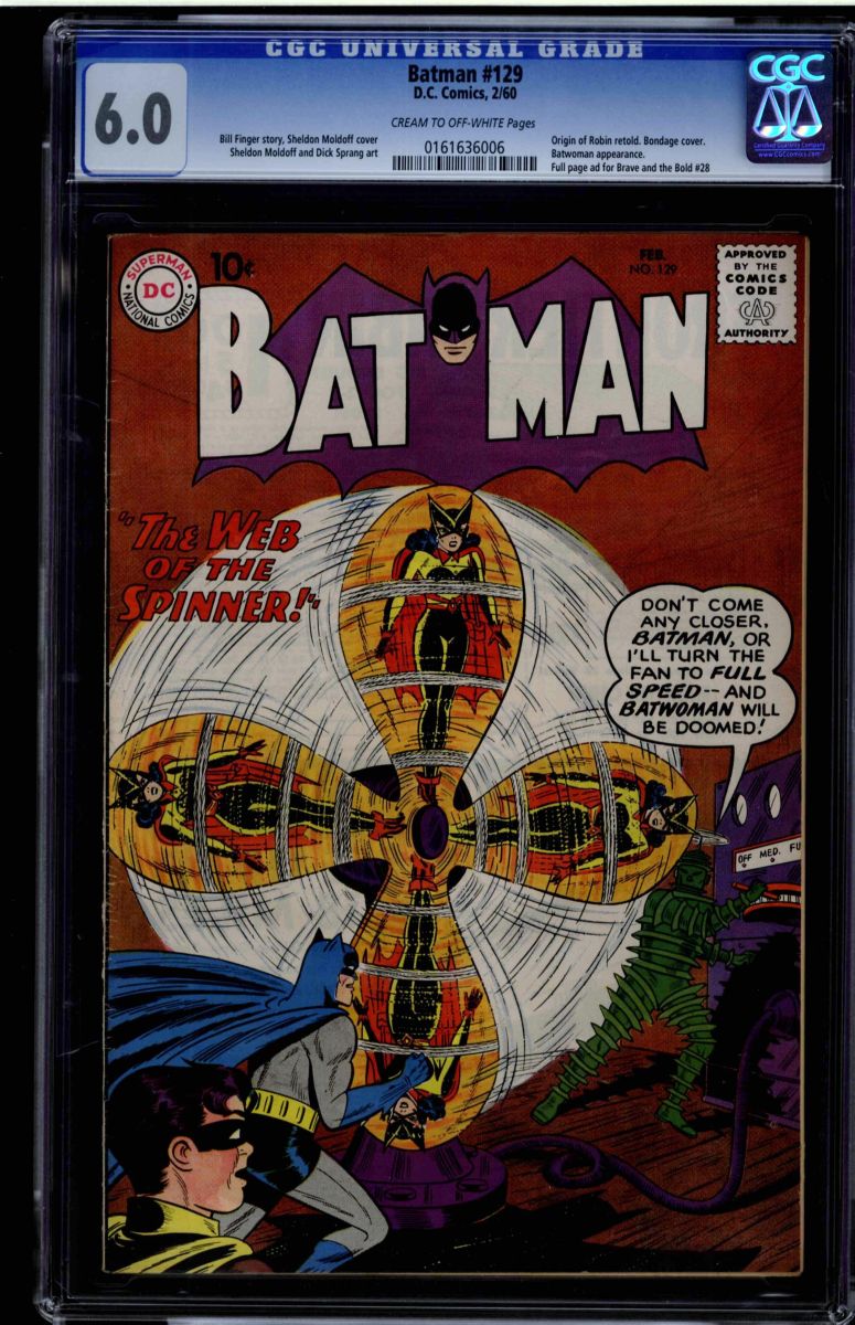 Batman #129 CGC 6.0 cream to off-white pages. Bill Finger story Sheldon Moldoff cover, Sheldon Moldoff and Dick Sprang art. Batwoman appearance. Full page ad for Brave and the Bold #28. Origin of Robin retold. Bondage cover. Overstreet 2009 FN 6.0 value = $123. CGC census: 2 at 6.0, 9 higher.