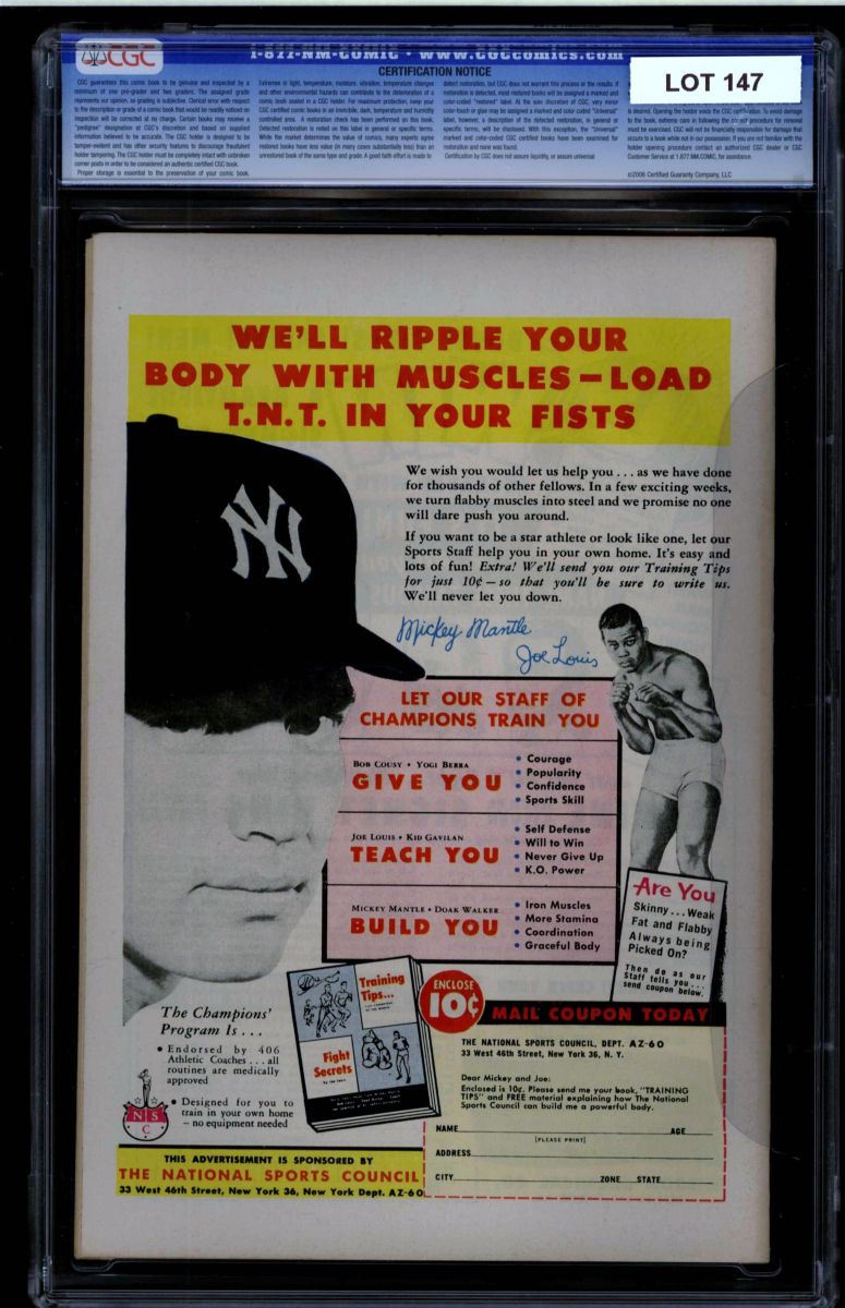 The Auctioneer has reserved the right to reject any and all bids, and to bid at the auction. Auctioneers Auctions are not on approval. Auctioneer does not allow certified material to be returned because of possible differences of opinion with respect to the grade offered by any third party organization, dealer, or service. Absolutely no guarantee of grade is offered for un-certified property sold and subsequently submitted to a third-party grading service. There will be no exceptions to this policy. Under extremely limited circumstances, (e.g. gross cataloging error) a purchaser, who did not bid from the floor, may request Auctioneer to evaluate voiding a sale; such request must be made in writing detailing the alleged gross error, and submission of the lot to the Auctioneer must be pre-approved by the Auctioneer. Bidder must notify Auctioneer in writing of such request within three (3) days of the non-floor bidder receipt of the lot. Any lot that is to be evaluated must be in our offices within 30 days after Auction. Grading does not qualify for this evaluation process nor do such complaints constitute a basis to challenge the authenticity of a lot. AFTER THAT 30-DAY PERIOD, NO LOTS MAY BE RETURNED FOR REASONS OTHER THAN AUTHENTICITY. Lots returned must be housed intact in the original holder. No lots purchased by floor Bidders may be returned (including those Bidders acting as agents for others). Late remittance for purchases may be considered just cause to revoke all return privileges. B: Auctions conducted solely on the Internet have a THREE (3) DAY RETURN POLICY: Lots paid for within seven days of the Auction closing are sold with a three (3) day return privilege. You may return lots under the following conditions: Within three days of receipt of the lot, you must first notify Auctioneer by contacting Client Service by phone (314-680-8599) or e-mail (moundcityauctions@gmail.com), and immediately mail the lot(s) fully insured to the attention of Returns, Mound City Auctions 1081 Teson Rd. Hazelwood, MO. 63042. Lots must be housed intact in their original holder and in their original condition. You are responsible for the insured, safe delivery of any lots. Auctioneer will not be responsible for lots returned in non-registered mail or lots returned without prior authorization per section B. A non-negotiable return fee of 5% of the purchase price ($10 per lot minimum) will be deducted from the refund for each returned lot or billed directly. Postage and handling fees are not refunded. After the three-day period (from receipt), no items may be returned for any reason. Late remittance for purchases revokes all Return-Restock privileges. C: Bidders who have inspected the lots prior to the auction will not be granted any return privileges. D: Comic books sold referencing a third-party grading service are sold “as is” without any express or implied warranty. Certain warranties may be available from the grading services and the Bidder is referred to them for further details: Certified Guaranty Company, LLC. (CGC), P.O. Box 4738, Sarasota, FL 34230. E: Bidders who intend to challenge authenticity or provenance of a lot must notify Auctioneer in writing within thirty (30) days of the Auctions conclusion. In the event Auctioneer cannot deliver the lot or subsequently it is established that the lot lacks title, provenance, authenticity, or other transfer or condition issue is claimed, Auctioneer's liability shall be limited to rescission of sale and refund of purchase price; in no case shall Auctioneer's maximum liability exceed the high bid on that lot, which bid shall be deemed for all purposes the value of the lot. After one year has elapsed, Auctioneer's maximum liability shall be limited to any commissions and fees Auctioneer earned on that lot. F: All comics are guaranteed genuine, but are not guaranteed as to grade, since grading is a matter of opinion, an art and not a science, and therefore the opinion rendered by the Auctioneer or any third party grading service may not agree with the opinion of others (including trained experts), and the same expert may not grade the same item with the same grade at two different times. G: Since we cannot examine encapsulated comics, they are sold “as is”without our grading opinion, and may not be returned for any reason. Auctioneer shall not be liable for any patent or latent defect or controversy pertaining to or arising from any encapsulated collectible. In any such instance, purchaser's remedy, if any, shall be solely against the service certifying the collectible. H: Due to changing grading standards over time, differing interpretations, and to possible mishandling of items by subsequent owners, Auctioneer reserves the right to grade items differently than shown on certificates from any grading service that accompany the items. Auctioneer also reserves the right to grade items differently than the grades shown in the prior catalog should such items be reconsigned to any future auction. I: Although consensus grading is employed by most grading services, it should be noted as aforesaid that grading is not an exact science. In fact, it is entirely possible that if a lot is broken out of a plastic holder and resubmitted to another grading service or even to the same service, the lot could come back with a different grade assigned. J: Certification does not guarantee protection against the normal risks associated with potentially volatile markets. The degree of liquidity for certified collectibles will vary according to general market conditions and the particular lot involved. For some lots there may be no active market at all at certain points in time."