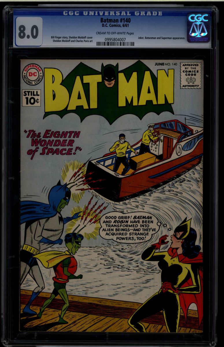 Batman #140 CGC 8.0 cream to off-white pages. Bill Finger story Sheldon Moldoff cover, Sheldon Moldoff and Charles Paris art. Joker Batwoman and Superman appearance. Overstreet 2009 VF 8.0 value = $176. CGC census: 3 at 8.0, 8 higher.