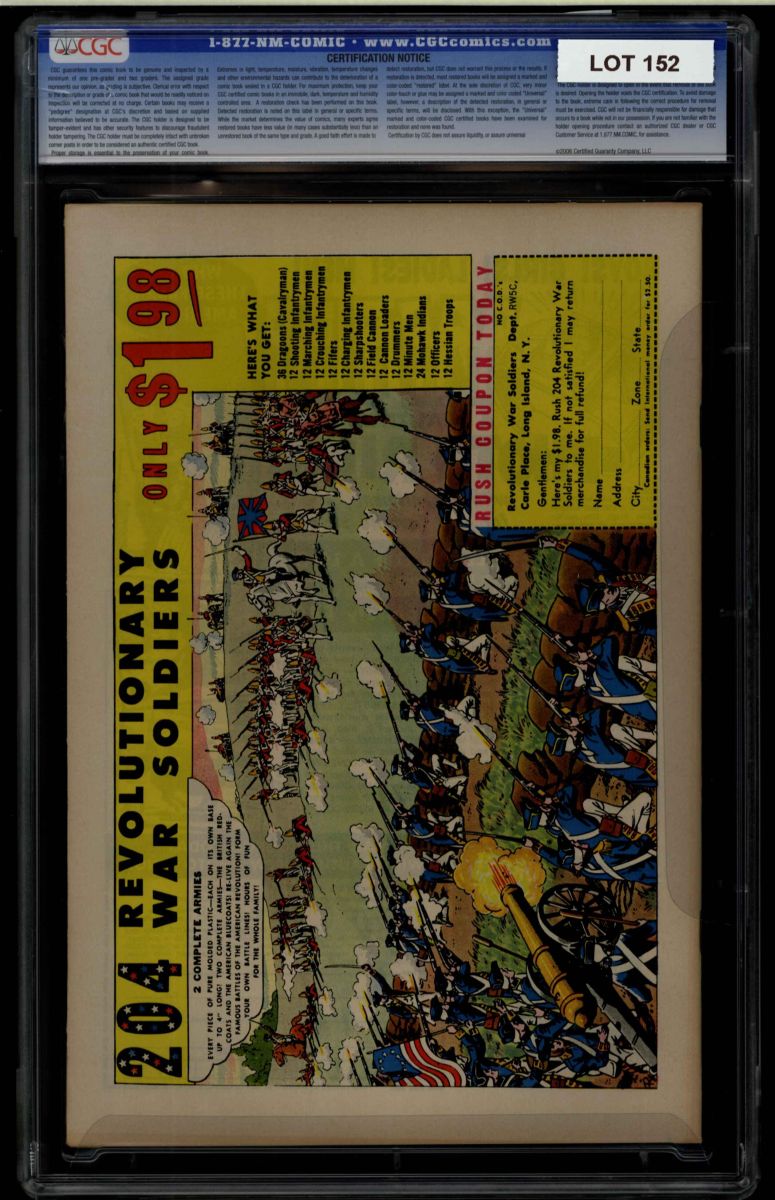 The Auctioneer has reserved the right to reject any and all bids, and to bid at the auction. Auctioneers Auctions are not on approval. Auctioneer does not allow certified material to be returned because of possible differences of opinion with respect to the grade offered by any third party organization, dealer, or service. Absolutely no guarantee of grade is offered for un-certified property sold and subsequently submitted to a third-party grading service. There will be no exceptions to this policy. Under extremely limited circumstances, (e.g. gross cataloging error) a purchaser, who did not bid from the floor, may request Auctioneer to evaluate voiding a sale; such request must be made in writing detailing the alleged gross error, and submission of the lot to the Auctioneer must be pre-approved by the Auctioneer. Bidder must notify Auctioneer in writing of such request within three (3) days of the non-floor bidder receipt of the lot. Any lot that is to be evaluated must be in our offices within 30 days after Auction. Grading does not qualify for this evaluation process nor do such complaints constitute a basis to challenge the authenticity of a lot. AFTER THAT 30-DAY PERIOD, NO LOTS MAY BE RETURNED FOR REASONS OTHER THAN AUTHENTICITY. Lots returned must be housed intact in the original holder. No lots purchased by floor Bidders may be returned (including those Bidders acting as agents for others). Late remittance for purchases may be considered just cause to revoke all return privileges. B: Auctions conducted solely on the Internet have a THREE (3) DAY RETURN POLICY: Lots paid for within seven days of the Auction closing are sold with a three (3) day return privilege. You may return lots under the following conditions: Within three days of receipt of the lot, you must first notify Auctioneer by contacting Client Service by phone (314-680-8599) or e-mail (moundcityauctions@gmail.com), and immediately mail the lot(s) fully insured to the attention of Returns, Mound City Auctions 1081 Teson Rd. Hazelwood, MO. 63042. Lots must be housed intact in their original holder and in their original condition. You are responsible for the insured, safe delivery of any lots. Auctioneer will not be responsible for lots returned in non-registered mail or lots returned without prior authorization per section B. A non-negotiable return fee of 5% of the purchase price ($10 per lot minimum) will be deducted from the refund for each returned lot or billed directly. Postage and handling fees are not refunded. After the three-day period (from receipt), no items may be returned for any reason. Late remittance for purchases revokes all Return-Restock privileges. C: Bidders who have inspected the lots prior to the auction will not be granted any return privileges. D: Comic books sold referencing a third-party grading service are sold “as is” without any express or implied warranty. Certain warranties may be available from the grading services and the Bidder is referred to them for further details: Certified Guaranty Company, LLC. (CGC), P.O. Box 4738, Sarasota, FL 34230. E: Bidders who intend to challenge authenticity or provenance of a lot must notify Auctioneer in writing within thirty (30) days of the Auctions conclusion. In the event Auctioneer cannot deliver the lot or subsequently it is established that the lot lacks title, provenance, authenticity, or other transfer or condition issue is claimed, Auctioneer's liability shall be limited to rescission of sale and refund of purchase price; in no case shall Auctioneer's maximum liability exceed the high bid on that lot, which bid shall be deemed for all purposes the value of the lot. After one year has elapsed, Auctioneer's maximum liability shall be limited to any commissions and fees Auctioneer earned on that lot. F: All comics are guaranteed genuine, but are not guaranteed as to grade, since grading is a matter of opinion, an art and not a science, and therefore the opinion rendered by the Auctioneer or any third party grading service may not agree with the opinion of others (including trained experts), and the same expert may not grade the same item with the same grade at two different times. G: Since we cannot examine encapsulated comics, they are sold “as is”without our grading opinion, and may not be returned for any reason. Auctioneer shall not be liable for any patent or latent defect or controversy pertaining to or arising from any encapsulated collectible. In any such instance, purchaser's remedy, if any, shall be solely against the service certifying the collectible. H: Due to changing grading standards over time, differing interpretations, and to possible mishandling of items by subsequent owners, Auctioneer reserves the right to grade items differently than shown on certificates from any grading service that accompany the items. Auctioneer also reserves the right to grade items differently than the grades shown in the prior catalog should such items be reconsigned to any future auction. I: Although consensus grading is employed by most grading services, it should be noted as aforesaid that grading is not an exact science. In fact, it is entirely possible that if a lot is broken out of a plastic holder and resubmitted to another grading service or even to the same service, the lot could come back with a different grade assigned. J: Certification does not guarantee protection against the normal risks associated with potentially volatile markets. The degree of liquidity for certified collectibles will vary according to general market conditions and the particular lot involved. For some lots there may be no active market at all at certain points in time."