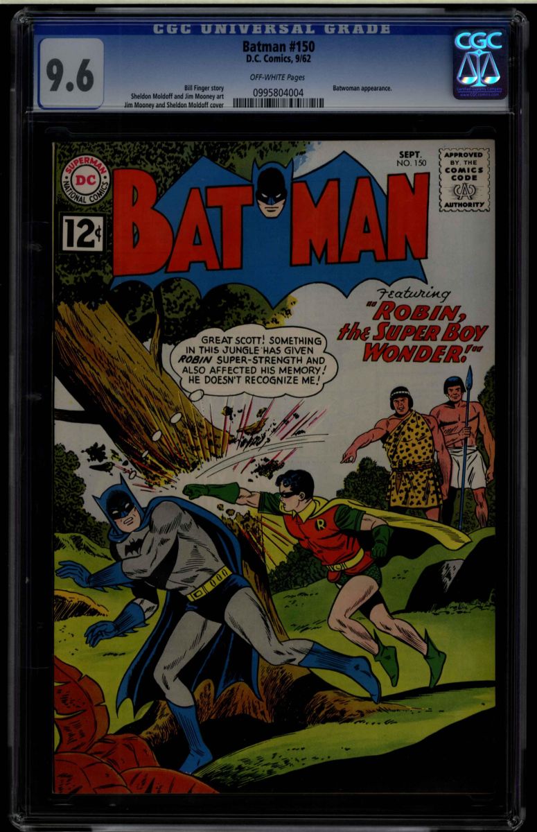Batman #150 CGC 9.6 off-white pages. Bill Finger story, Sheldon Moldoff and Jim Mooney art, Jim Mooney and Sheldon Moldoff cover. Batwoman appearance. Overstreet 2009 NM 9.2 value = $325. CGC census: 1 at 9.6, none higher!