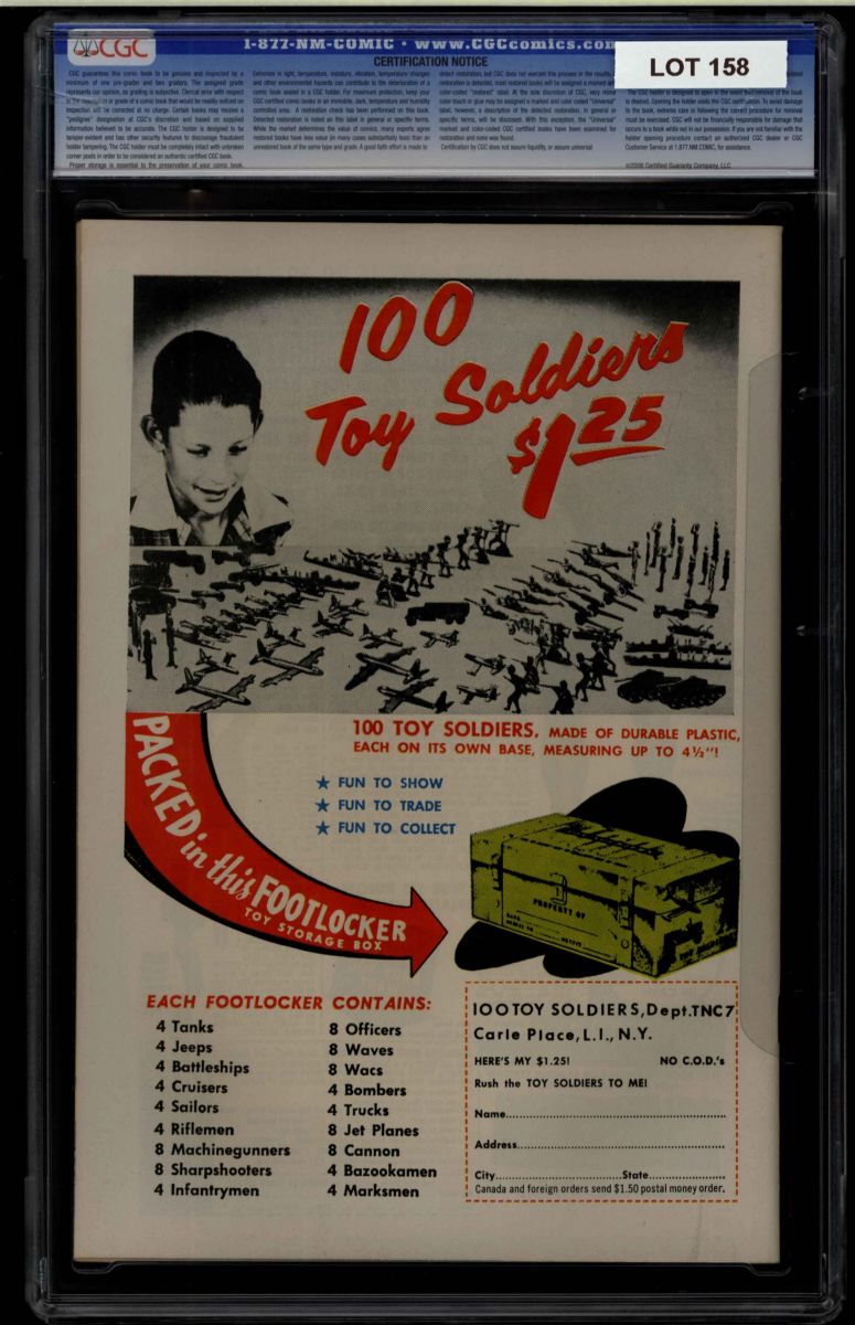 The Auctioneer has reserved the right to reject any and all bids, and to bid at the auction. Auctioneers Auctions are not on approval. Auctioneer does not allow certified material to be returned because of possible differences of opinion with respect to the grade offered by any third party organization, dealer, or service. Absolutely no guarantee of grade is offered for un-certified property sold and subsequently submitted to a third-party grading service. There will be no exceptions to this policy. Under extremely limited circumstances, (e.g. gross cataloging error) a purchaser, who did not bid from the floor, may request Auctioneer to evaluate voiding a sale; such request must be made in writing detailing the alleged gross error, and submission of the lot to the Auctioneer must be pre-approved by the Auctioneer. Bidder must notify Auctioneer in writing of such request within three (3) days of the non-floor bidder receipt of the lot. Any lot that is to be evaluated must be in our offices within 30 days after Auction. Grading does not qualify for this evaluation process nor do such complaints constitute a basis to challenge the authenticity of a lot. AFTER THAT 30-DAY PERIOD, NO LOTS MAY BE RETURNED FOR REASONS OTHER THAN AUTHENTICITY. Lots returned must be housed intact in the original holder. No lots purchased by floor Bidders may be returned (including those Bidders acting as agents for others). Late remittance for purchases may be considered just cause to revoke all return privileges. B: Auctions conducted solely on the Internet have a THREE (3) DAY RETURN POLICY: Lots paid for within seven days of the Auction closing are sold with a three (3) day return privilege. You may return lots under the following conditions: Within three days of receipt of the lot, you must first notify Auctioneer by contacting Client Service by phone (314-680-8599) or e-mail (moundcityauctions@gmail.com), and immediately mail the lot(s) fully insured to the attention of Returns, Mound City Auctions 1081 Teson Rd. Hazelwood, MO. 63042. Lots must be housed intact in their original holder and in their original condition. You are responsible for the insured, safe delivery of any lots. Auctioneer will not be responsible for lots returned in non-registered mail or lots returned without prior authorization per section B. A non-negotiable return fee of 5% of the purchase price ($10 per lot minimum) will be deducted from the refund for each returned lot or billed directly. Postage and handling fees are not refunded. After the three-day period (from receipt), no items may be returned for any reason. Late remittance for purchases revokes all Return-Restock privileges. C: Bidders who have inspected the lots prior to the auction will not be granted any return privileges. D: Comic books sold referencing a third-party grading service are sold “as is” without any express or implied warranty. Certain warranties may be available from the grading services and the Bidder is referred to them for further details: Certified Guaranty Company, LLC. (CGC), P.O. Box 4738, Sarasota, FL 34230. E: Bidders who intend to challenge authenticity or provenance of a lot must notify Auctioneer in writing within thirty (30) days of the Auctions conclusion. In the event Auctioneer cannot deliver the lot or subsequently it is established that the lot lacks title, provenance, authenticity, or other transfer or condition issue is claimed, Auctioneer's liability shall be limited to rescission of sale and refund of purchase price; in no case shall Auctioneer's maximum liability exceed the high bid on that lot, which bid shall be deemed for all purposes the value of the lot. After one year has elapsed, Auctioneer's maximum liability shall be limited to any commissions and fees Auctioneer earned on that lot. F: All comics are guaranteed genuine, but are not guaranteed as to grade, since grading is a matter of opinion, an art and not a science, and therefore the opinion rendered by the Auctioneer or any third party grading service may not agree with the opinion of others (including trained experts), and the same expert may not grade the same item with the same grade at two different times. G: Since we cannot examine encapsulated comics, they are sold “as is”without our grading opinion, and may not be returned for any reason. Auctioneer shall not be liable for any patent or latent defect or controversy pertaining to or arising from any encapsulated collectible. In any such instance, purchaser's remedy, if any, shall be solely against the service certifying the collectible. H: Due to changing grading standards over time, differing interpretations, and to possible mishandling of items by subsequent owners, Auctioneer reserves the right to grade items differently than shown on certificates from any grading service that accompany the items. Auctioneer also reserves the right to grade items differently than the grades shown in the prior catalog should such items be reconsigned to any future auction. I: Although consensus grading is employed by most grading services, it should be noted as aforesaid that grading is not an exact science. In fact, it is entirely possible that if a lot is broken out of a plastic holder and resubmitted to another grading service or even to the same service, the lot could come back with a different grade assigned. J: Certification does not guarantee protection against the normal risks associated with potentially volatile markets. The degree of liquidity for certified collectibles will vary according to general market conditions and the particular lot involved. For some lots there may be no active market at all at certain points in time."