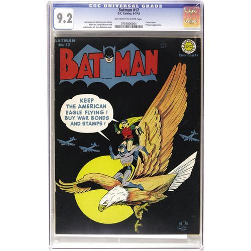 <B>Batman #17 (DC, 1943) CGC NM- 9.2 Off-white to white pages.</B></I> It warms our heart to know that there are still original-owner books out there that measure up to the comics from the established pedigree collections. The black cover looks superb, and it showcases one of the best cover images of this series' early run, drawn by Jerry Robinson. Inside the comic, the Penguin is featured, and Jack Burnley handled the art chores. This one would look great in your Bat-collection! Overstreet 2006 NM- 9.2 value = $3,200. CGC census 7/06: 2 in 9.2, 1 higher. <BR><BR><B>Important notice:</B> Heritage usually auctions material at the rate of 200-250 lots per hour. On some occasions eBay Live bid software or the Internet may not be able to keep up with the pace of the auction. We recommend placing a realistic absentee bid now as insurance to avoid disappointment. Occasionally the auctioneer may eliminate or reject an eBay Live bid, and the auctioneer may also reopen a lot after the close of the eBay live bidding (usually because we missed an audience bid), and may reject your bid even if it shows you as the winning bidder. By bidding via eBay Live, you agree that Heritage may award the lot to another bidder at its sole discretion under the circumstances described above or any other reasonable circumstances. Since eBay bids are not shown to us until we open the lot on the floor, we treat those bids just like floor bids. In most cases the floor responds before the eBay bid is presented to us, due to Internet lag time, so for consistency we have made it a policy that floor bids are always considered first over tie eBay live bids. Also please note that all Heritage lots purchased through eBay Live carry a 22.5% Buyer's Premium. Please make sure you read the Terms and Conditions before you bid. This lot is being auctioned in conjunction with a live floor auction by Heritage Auction Galleries. All final auction and invoice information will be supplied by Heritage Auction Galleries, and all other information should be considered preliminary. Lot:41001 <BR><BR><B>Winning Notification and Billing:</B> After the FINAL session in this auction is complete, Heritage will send e-mail and snail mail invoices. This process normally takes several days. All final auction and invoice information will be supplied by Heritage Auction Galleries, and all other information should be considered preliminary. <BR><BR>This auction will be conducted on a live auction floor and over the Internet through eBay Live. If you choose to place an absentee bid, please take a moment to <font color='#0000ff'><u><a href='http://pages.ebay.com/liveauctions/help/before/laabsentee.html'>learn how eBay Live absentee bidding works</a></u></font><font color='#000000'>
