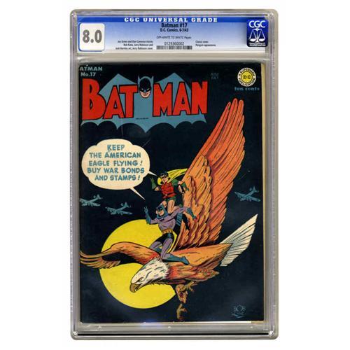 <B>Batman #17 (DC, 1943) CGC VF 8.0 Off-white to white pages.</B></I> We never tire of repeating that comics with black covers are difficult to find in high grade, and indeed, only a handful of copies of this issue have been graded higher than our offering. And what a cover image it is -- Jerry Robinson handled art chores on the "buy war bonds" scene. Inside the covers of the issue is an unusual Penguin yarn, in which the Bumbershoot Bandit hears someone say that he's nothing without his trick umbrellas, and the Penguin responds by using other gadgets for his crimes! The issue's interior artists include Robinson, Bob Kane, and Jack Burnley. Overstreet 2005 VF 8.0 value = $1,444. CGC census 11/05: 9 in 8.0, 6 higher.