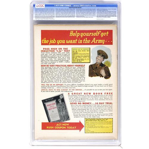 <B>Batman #18 (DC, 1943) CGC VF+ 8.5 Off-white to white pages.</B></I> This freshly-certified copy just missed the top spot in CGC's census, with the best known copy tantalizingly within reach at 9.0. This issue is popular thanks to its comedy cover - if anyone deserved a stick of dynamite in the face, it was the despotic trio of Hitler, Mussolini, and Hirohito. Inside the issue, Batman and Robin take on the corpulent duo of Tweedledum and Tweedledee as well as the "Crime Surgeon," Matthew Thorne. Jerry Robinson and Jack Burnley contributed interior art. Overstreet 2006 VF 8.0 value = $1,900; VF/NM 9.0 value = $3,000. CGC census 7/06: 2 in 8.5, 1 higher. <BR><BR><B>Important notice:</B> Heritage usually auctions material at the rate of 200-250 lots per hour. On some occasions eBay Live bid software or the Internet may not be able to keep up with the pace of the auction. We recommend placing a realistic absentee bid now as insurance to avoid disappointment. Occasionally the auctioneer may eliminate or reject an eBay Live bid, and the auctioneer may also reopen a lot after the close of the eBay live bidding (usually because we missed an audience bid), and may reject your bid even if it shows you as the winning bidder. By bidding via eBay Live, you agree that Heritage may award the lot to another bidder at its sole discretion under the circumstances described above or any other reasonable circumstances. Since eBay bids are not shown to us until we open the lot on the floor, we treat those bids just like floor bids. In most cases the floor responds before the eBay bid is presented to us, due to Internet lag time, so for consistency we have made it a policy that floor bids are always considered first over tie eBay live bids. Also please note that all Heritage lots purchased through eBay Live carry a 22.5% Buyer's Premium. Please make sure you read the Terms and Conditions before you bid. This lot is being auctioned in conjunction with a live floor auction by Heritage Auction Galleries. All final auction and invoice information will be supplied by Heritage Auction Galleries, and all other information should be considered preliminary. Lot:41001 <BR><BR><B>Winning Notification and Billing:</B> After the FINAL session in this auction is complete, Heritage will send e-mail and snail mail invoices. This process normally takes several days. All final auction and invoice information will be supplied by Heritage Auction Galleries, and all other information should be considered preliminary. <BR><BR>This auction will be conducted on a live auction floor and over the Internet through eBay Live. If you choose to place an absentee bid, please take a moment to <font color='#0000ff'><u><a href='http://pages.ebay.com/liveauctions/help/before/laabsentee.html'>learn how eBay Live absentee bidding works</a></u></font><font color='#000000'>