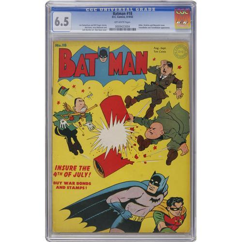 <B>Batman #18 (DC, 1943) CGC FN+ 6.5 Off-white pages.</B></I> Hitler, Hirohito, and Mussolini getting their comeuppance makes for a very collectible cover -- it's humor specialist Stan Kaye providing the cover art. Overstreet 2006 FN 6.0 value = $912; VF 8.0 value = $1,900. CGC census 3/07: 7 in 6.5, 11 higher.<BR><BR><b>Shipping:</b> Comics - Slabbed (certified) (<a target="_blank" href="http://www.heritageauctions.com/common/shipping.php">view shipping information</a>)