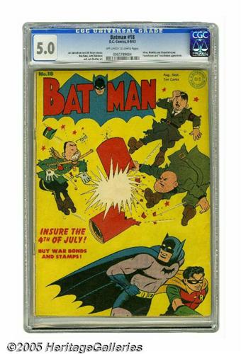 <B>Batman #18 (DC, 1943) CGC VG/FN 5.0 Off-white to white pages.</B></I> Those Axis troublemakers, Hitler, Hirohito, and Mussolini feel the results of a good ol' American Fourth of July, courtesy of the Dynamic Duo on this cool World War II-era cover. Bob Kane, Jerry Robinson, and Jack Burnley's combined artistic skills insure that this is indeed a bang-up issue. Tweedledee and Tweedledum are featured in one story. This is a solid, attractive mid-grade copy. Overstreet 2005 VG 4.0 value = $584; FN 6.0 value = $876. CGC census 6/05: 8 in 5.0, 14 higher.