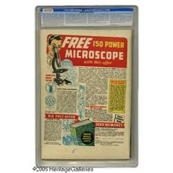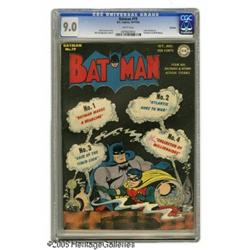 <B>Batman #19 Spokane pedigree (DC, 1943) CGC VF/NM 9.0 White pages.</B></I> With apologies to Messrs. Moldoff, Robinson, etc., you could make a strong case for Dick Sprang as <I>the</B></I> Batman artist of the Golden Age. That makes the publication of this issue a happy moment for DC fandom, as it was Sprang's first work on Batman -- he handled both the cover art and all Batman features on the interior of this issue. That milestone, coupled with the fact that this book has bone-white pages, are enough to send collectors into a feeding frenzy, but it also has a Joker appearance. This black cover is just about as nice as you could hope to find. Overstreet 2004 VF/NM 9.0 value = $1,800; NM- 9.2 value = $2,400. CGC census 12/04: 3 in 9.0, 1 higher.