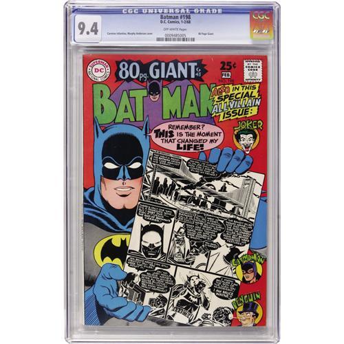 <B>Batman #198 (DC, 1968) CGC NM 9.4 Off-white pages.</B></I> Aka <B>80 Page Giant</B></I> G-43. All-Villain issue. Carmine Infantino and Murphy Anderson cover. Joker cover and story. Overstreet 2006 NM- 9.2 value = $125. CGC census 3/07: 1 in 9.4, 1 higher. <I> From the Warren Hall Collection.</B></I><BR><BR><b>Shipping:</b> Comics - Slabbed (certified) (<a target="_blank" href="http://www.heritageauctions.com/common/shipping.php">view shipping information</a>)