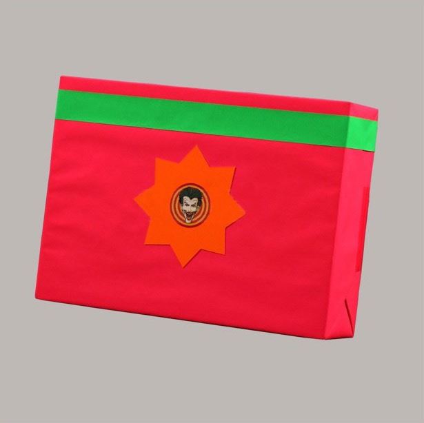 "Smylex" gift box used in the production of the 1989 Tim Burton classic Batman. This type of gift box can be seen in the Joker's TV commercial. This piece is wrapped ion bright pink paper with a green stripe and a small image of the Joker's face. This piece remains in excellent, production used condition.
