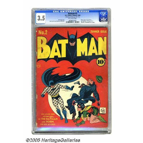 <B>Batman #2 (DC, 1940) CGC VG- 3.5 Off-white pages.</B></I> Two of DC's villainous VIPs made only their second appearances in this issue. Not only does that jocund jack-of-all-crimes, the Joker, pop up for only the second time, he has purr-fect accompaniment in the form of Catwoman. In fact, this issue had the debut of the name ""Catwoman,"" as the lady was called ""the Cat"" in her previous appearance. The art is by Bob Kane with the assistance of his lieutenants Jerry Robinson and George Roussos. CGC notes, ""Small piece out of 20th page, affects story."" Overstreet 2005 VG 4.0 value = $2,470. CGC census 8/05: 5 in 3.5, 17 higher. <BR><BR><B>Important notice:</B> Heritage usually auctions material at the rate of 200-250 lots per hour. On some occasions eBay Live bid software or the Internet may not be able to keep up with the pace of the auction. We recommend placing a realistic absentee bid now as insurance to avoid disappointment. Occasionally the auctioneer may eliminate or reject an eBay Live bid, and the auctioneer may also reopen a lot after the close of the eBay live bidding (usually because we missed an audience bid), and may reject your bid even if it shows you as the winning bidder. By bidding via eBay Live, you agree that Heritage may award the lot to another bidder at its sole discretion under the circumstances described above or any other reasonable circumstances. Since eBay bids are not shown to us until we open the lot on the floor, we treat those bids just like floor bids. In most cases the floor responds before the eBay bid is presented to us, due to Internet lag time, so for consistency we have made it a policy that floor bids are always considered first over tie eBay live bids. Also please note that all Heritage lots purchased through eBay Live carry a 20% Buyer's Premium. Please make sure you read the Terms and Conditions before you bid. This lot is being auctioned in conjunction with a live floor auction by Heritage Galleries & Auctioneers. A