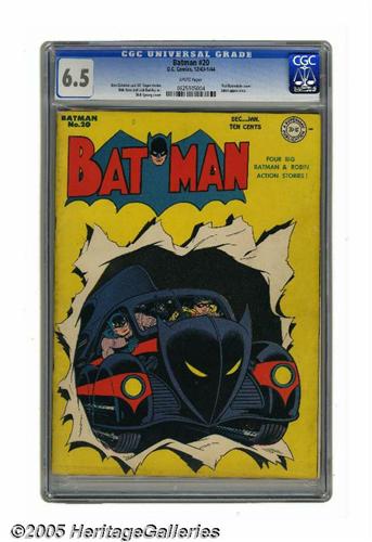 <B>Batman #20 (DC, 1943) CGC FN+ 6.5 White pages.</B></I> This eye-catching cover by Dick Sprang is the first time the Batmobile appeared on a comic book cover! There's also a story featuring that Leonardo of the Larcenous Laugh, the Joker. Plus: could Bruce Wayne lose custody of Dick Grayson to an unscrupulous relative? Find out in a nail-biting backup feature. Interior artists in this issue include Jack Burnley, Bob Kane, and Jerry Robinson. Overstreet 2005 FN 6.0 value = $693; VF 8.0 value = $1,444. CGC census 3/05: 1 in 6.5, 22 higher. <I>From the Northern Lights Collection.</B></I>