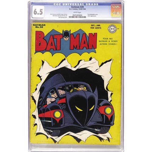 <B>Batman #20 (DC, 1943) CGC FN+ 6.5 White pages.</B></I> This eye-catching cover by Dick Sprang is the first time the Batmobile appeared on a comic book cover! There's also a story featuring that Leonardo of the Larcenous Laugh, the Joker. Plus: could Bruce Wayne lose custody of Dick Grayson to an unscrupulous relative? Find out in a nail-biting backup feature. Interior artists in this issue include Jack Burnley, Bob Kane, and Jerry Robinson. Overstreet 2006 FN 6.0 value = $711; VF 8.0 value = $1,481. CGC census 5/06: 3 in 6.5, 24 higher. <BR><BR><B>Important notice:</B> Heritage usually auctions material at the rate of 200-250 lots per hour. On some occasions eBay Live bid software or the Internet may not be able to keep up with the pace of the auction. We recommend placing a realistic absentee bid now as insurance to avoid disappointment. Occasionally the auctioneer may eliminate or reject an eBay Live bid, and the auctioneer may also reopen a lot after the close of the eBay live bidding (usually because we missed an audience bid), and may reject your bid even if it shows you as the winning bidder. By bidding via eBay Live, you agree that Heritage may award the lot to another bidder at its sole discretion under the circumstances described above or any other reasonable circumstances. Since eBay bids are not shown to us until we open the lot on the floor, we treat those bids just like floor bids. In most cases the floor responds before the eBay bid is presented to us, due to Internet lag time, so for consistency we have made it a policy that floor bids are always considered first over tie eBay live bids. Also please note that all Heritage lots purchased through eBay Live carry a 22.5% Buyer's Premium. Please make sure you read the Terms and Conditions before you bid. This lot is being auctioned in conjunction with a live floor auction by Heritage Auction Galleries. All final auction and invoice information will be supplied by Heritage Auction Galleries, and all other information should be considered preliminary. Lot:41001 <BR><BR><B>Winning Notification and Billing:</B> After the FINAL session in this auction is complete, Heritage will send e-mail and snail mail invoices. This process normally takes several days. All final auction and invoice information will be supplied by Heritage Auction Galleries, and all other information should be considered preliminary. <BR><BR>This auction will be conducted on a live auction floor and over the Internet through eBay Live. If you choose to place an absentee bid, please take a moment to <font color='#0000ff'><u><a href='http://pages.ebay.com/liveauctions/help/before/laabsentee.html'>learn how eBay Live absentee bidding works</a></u></font><font color='#000000'>