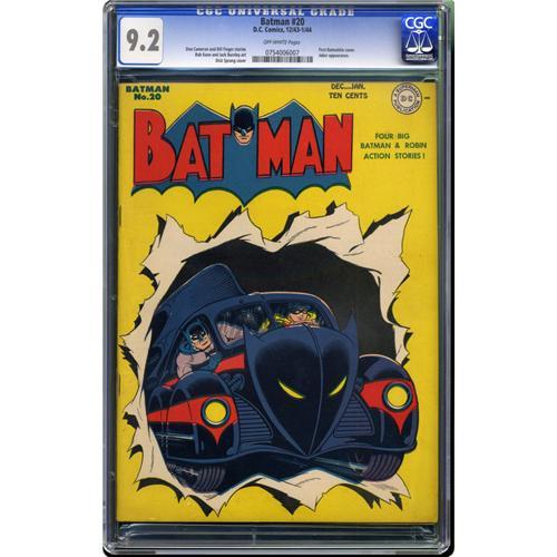 <B>Batman #20 (DC, 1943) CGC NM- 9.2 Off-white pages.</B></I> We haven't seen a copy to match this one, and neither has CGC as of this writing! This issue is known for being the first cover appearance of the Batmobile. Inside the issue, the Joker appears, and a backup feature has some pretty distressing events, as Dick Grayson's uncle tries to get custody of the Boy Wonder. The book has a Dick Sprang cover and interior art by Jack Burnley, Bob Kane, and Jerry Robinson. Overstreet 2006 NM- 9.2 value = $3,200. CGC census 3/06: 1 in 9.2, none higher. <I>From the Collection of Harold Curtis.</B></I>