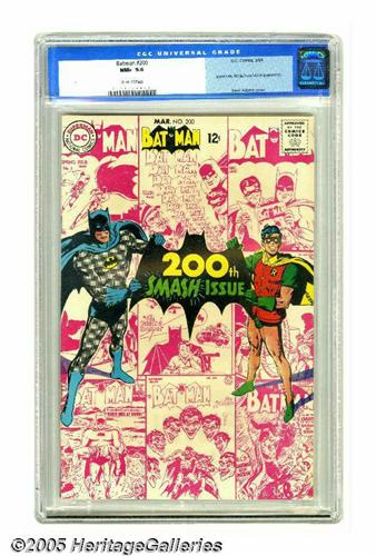 <B>Batman #200 (DC, 1968) CGC NM+ 9.6 Off-white pages.</B></I> Neal Adams' first work on this title was this cover illustration of Batman and Robin. This milestone issue includes cameos by the Joker and the Penguin. The interior art is by Chic Stone. Overstreet 2005 NM- 9.2 value = $170. CGC census 2/05: 6 in 9.6, 1 higher.