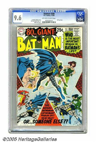 <B>Batman #208 (DC, 1969) CGC NM+ 9.6 Off-white to white pages.</B></I> The ladies in Batman's life, namely Catwoman, Batwoman, Batgirl, Poison Ivy, and Vicki Vale, are spotlighted in this square bound giant issue (aka <B>80-Page Giant</B></I> G-55). There's also a framing story drawn by Gil Kane with new facts on Batman's origin. The cover is by Nick Cardy. Overstreet 2005 NM- 9.2 value = $80. CGC census 5/05: 6 in 9.6, none higher.