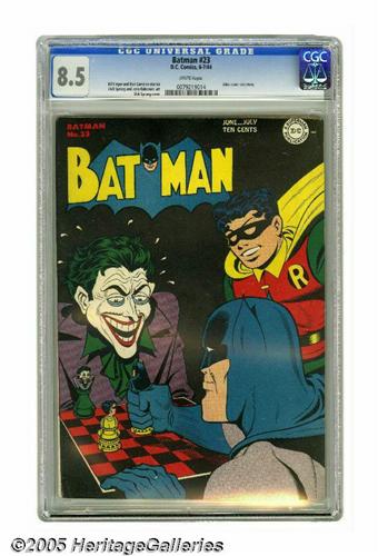 <B>Batman #23 (DC, 1944) CGC VF+ 8.5 White pages.</B></I> Finding black covers in higher grades is a perennial problem, so have a look at this VF+ specimen. The cover's by Dick Sprang, and of course it features the Joker. In the issue, that Brazen Buffoon is committing "The Upside Down Crimes," and the story ends with an upside-down battle between the fiend and Batman. The issue's interior art is by Sprang and Jerry Robinson. Overstreet 2005 VF 8.0 value = $1,538; VF/NM 9.0 value = $2,369. CGC census 6/05: 6 in 8.5, 8 higher.