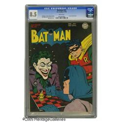 <B>Batman #23 (DC, 1944) CGC VF+ 8.5 White pages.</B></I> The black background of Dick Sprang's classic Joker cover makes this issue stand out, not to mention a challenge to find in high grade. Sprang and Jerry Robinson offer interior art. One of the most prized issues after the first 16, this is sure to be a favorite among Bat-bidders. Overstreet 2004 VF 8.0 value = $1,500; VF/NM 9.0 value = $2,250. CGC census 1/05: 5 in 8.5, 8 higher. <I>From the Northern Lights Collection</B></I>.