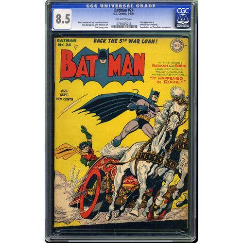 <B>Batman #24 (DC, 1944) CGC VF+ 8.5 Off-white pages.</B></I> Batman plays "Bat-Hur" on this colorful cover! It's one of Dick Sprang's earlier <B>Batman</B></I> covers, and one of his best -- check out the detail on the charging horses! Inside the comic, Prof. Carter Nichols and his hypnotic time-travel methods make their first appearance, and Tweedledum and Tweedledee appear. The interior art is by Sprang and Jerry Robinson. Overstreet 2006 VF 8.0 value = $963; VF/NM 9.0 value = $1,519. CGC census 3/06: 6 in 8.5, 9 higher. <I>From the Collection of Harold Curtis.</B></I>
