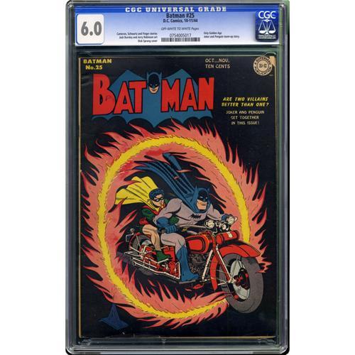 <B>Batman #25 (DC, 1944) CGC FN 6.0 Off-white to white pages.</B></I> Shades of Johnny Cash! Batman and Robin jump through a "burnin' ring of fire" on this great Dick Sprang cover. The real story is inside, though -- Overstreet calls this issue the "first team-up between two major villains!" How major? None other than the Joker and the Penguin! It's the only time those two teamed up in a Golden Age book, making this issue highly sought-after. As Fine-graded copies go, this one is a real beauty, with only some minor edge and corner wear keeping it from a higher grade. Overstreet 2006 FN 6.0 value = $711. CGC census 3/06: 3 in 6.0, 16 higher. <I>From the Collection of Harold Curtis.</B></I>