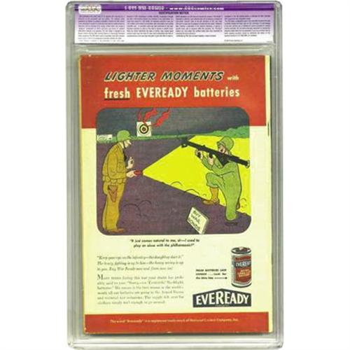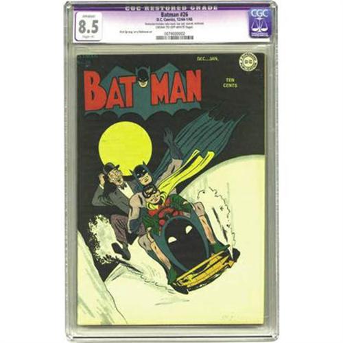 <B>Batman #26 (DC, 1945) CGC Apparent VF+ 8.5 Slight (P) Cream to off-white pages.</B></I> Move over Batmobile and Bat-plane - here comes the amazing Bat-sled! It's perfect for the pursuit of skiing criminals, or just for scaring the hat off poor Alfred. A fun "feel-good cover," for which Jerry Robinson became known during the 1940s. He and the equally distinctive Dick Sprang share the inside artwork duties on the Batman features. CGC notes, "Restoration includes: color touch, tear seal, cleaned, reinforced." This comic looks great; the restoration is unobtrusive and professional in quality. Overstreet 2003 GD 2.0 value = $150; VG 4.0 value = $300; FN 6.0 value = $450; VF 8.0 value = $938. <BR><BR><B>Important notice:</B> Heritage usually auctions material at the rate of 200-250 lots per hour. On some occasions eBay Live bid software or the Internet may not be able to keep up with the pace of the auction. We recommend placing a realistic absentee bid now as insurance to avoid disappointment. Occasionally the auctioneer may eliminate or reject an eBay Live bid, and the auctioneer may also reopen a lot after the close of the eBay live bidding (usually because we missed an audience bid), and may reject your bid even if it shows you as the winning bidder. By bidding via eBay Live, you agree that Heritage may award the lot to another bidder at its sole discretion under the circumstances described above or any other reasonable circumstances. Since eBay bids are not shown to us until we open the lot on the floor, we treat those bids just like floor bids. In most cases the floor responds before the eBay bid is presented to us, due to Internet lag time, so for consistency we have made it a policy that floor bids are always considered first over tie eBay live bids. Also please note that all Heritage lots purchased through eBay Live carry a 22.5% Buyer's Premium. Please make sure you read the Terms and Conditions before you bid. This lot is being auctioned in conjunction with a live floor auction by Heritage Auction Galleries. All final auction and invoice information will be supplied by Heritage Auction Galleries, and all other information should be considered preliminary. Lot:41001 <BR><BR><B>Winning Notification and Billing:</B> After the FINAL session in this auction is complete, Heritage will send e-mail and snail mail invoices. This process normally takes several days. All final auction and invoice information will be supplied by Heritage Auction Galleries, and all other information should be considered preliminary. <BR><BR>This auction will be conducted on a live auction floor and over the Internet through eBay Live. If you choose to place an absentee bid, please take a moment to <font color='#0000ff'><u><a href='http://pages.ebay.com/liveauctions/help/before/laabsentee.html'>learn how eBay Live absentee bidding works</a></u></font><font color='#000000'>