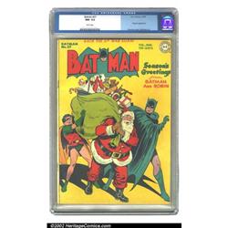Batman #27 (DC, 1945) CGC NM- 9.2 White pages. Batman and Robin give an assist to Santa on this classic Jack Burnley holiday cover, as the Penguin dukes it out with the Caped Crusader inside. Bright, white and looking near perfect, this copy has wonderful eye-appeal thanks to a clean cover and deep colors. And don't forget the white pages. Overstreet 2002 NM 9.4 value = $2,150. Important notice: We expect to be auctioning lots at the rate of 200-250 per hour. Sometimes eBay Premier live bid software cannot keep up with that pace, so we strongly recommend that you place a realistic proxy bid now as insurance to avoid disappointment. Also please note that all Heritage/CAA lots purchased through eBay Premier carry a 20% Buyer's Premium. Please make sure you read the Terms and Conditions.