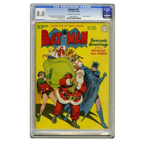 <B>Batman #27 (DC, 1945) CGC VF 8.0 Off-white to white pages.</B></I> A classic Christmas cover leads off this issue -- it's by the oft-underrated Jack Burnley. Inside the issue, the Dynamic Duo takes on that Bumbershoot Bandit, that Fowl Felon, that Man of a Thousand Umbrellas, the Penguin. There's also art by ace Bat-artist Jerry Robinson. Overstreet 2005 VF 8.0 value = $1,250. CGC census 11/05: 3 in 8.0, 17 higher.