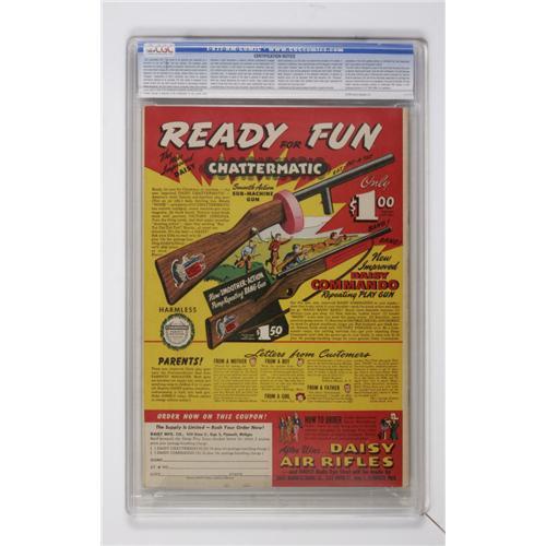 A classic Christmas cover leads off this issue -- it's by the oft-underrated Jack Burnley. Inside the issue, the Dynamic Duo takes on that Bumbershoot Bandit, that Fowl Felon, that Man of a Thousand Umbrellas, the Penguin. There's also art by ace Bat-artist Jerry Robinson. Overstreet 2006 VF 8.0 value = $1,275. CGC census 12/06: 6 in 8.0, 17 higher.<BR><BR><b>Shipping:</b> Slabbed Comic (<a target="_blank" href="http://www.heritageauctions.com/common/shipping.php">view shipping information</a>)