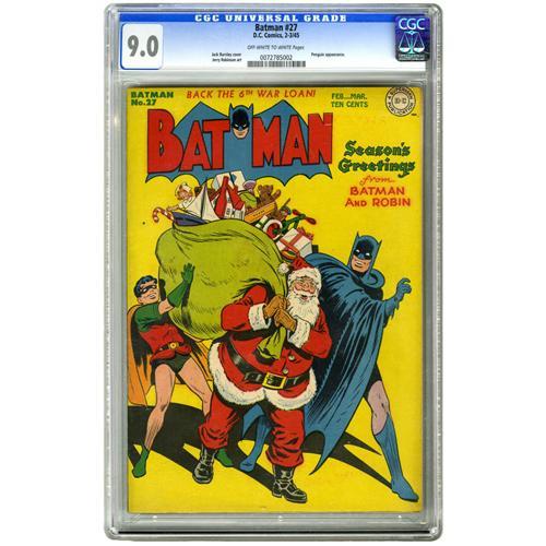 <B>Batman #27 (DC, 1945) CGC VF/NM 9.0 Off-white to white pages.</B></I> "Classic" is Overstreet's designation for Jack Burnley's heartwarming Christmas cover scene. We heartily agree, and fervently hope that Santa has that much in his sack the next time he visits us! Inside the issue, Batman and Robin take on the Penguin. Also, there's Jerry Robinson art in the issue. Overstreet 2006 VF/NM 9.0 value = $2,013; NM- 9.2 value = $2,750. CGC census 3/06: 7 in 9.0, 6 higher.