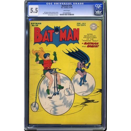 <B>Batman #29 (DC, 1945) CGC FN- 5.5 White pages.</B></I> Dick Sprang rendered this issue's cover as well as the Batman stories inside. The issue also features an Alfred solo story. Overstreet 2006 FN 6.0 value = $462. CGC census 1/06: 1 in 5.5, 20 higher. <I>From the Collection of Harold Curtis.</B></I>