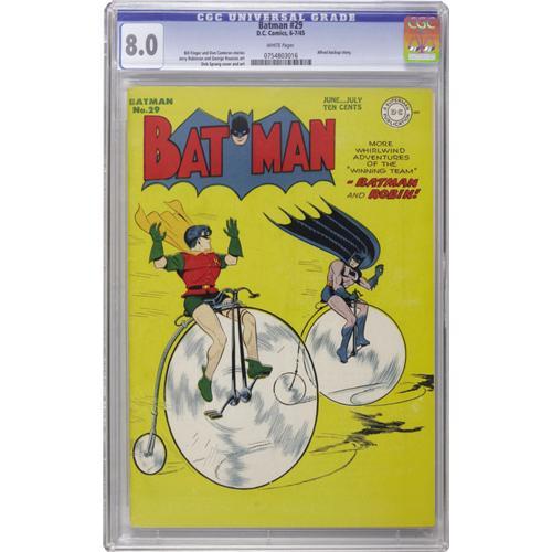 <B>Batman #29 (DC, 1945) CGC VF 8.0 White pages.</B></I> Dick Sprang rendered this issue's cover as well as the Batman stories inside. The issue also features an Alfred solo story. Overstreet 2006 VF 8.0 value = $963. CGC census 10/06: 1 in 8.0, 8 higher.<BR><BR><b>Shipping:</b> Slabbed Comic (<a target="_blank" href="http://www.heritageauctions.com/common/shipping.php">view shipping information</a>)