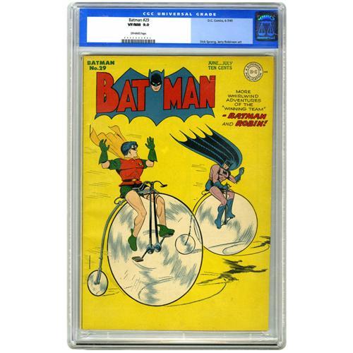 <B>Batman #29 (DC, 1945) CGC VF/NM 9.0 Off-white pages.</B></I> A Dick Sprang cover gets this issue rolling; Jerry Robinson continues the thrill with his artistic skills inside. This flat, sharp copy looks as if it was opened only once or twice -- very carefully! The staples show very little stress from reading. Overstreet 2006 VF/NM 9.0 value = $1,519; NM- 9.2 value = $2,075. CGC census 3/06: 5 in 9.0, 1 higher.