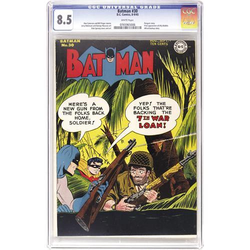 <B>Batman #30 (DC, 1945) CGC VF+ 8.5 White pages.</B></I> Dick Sprang delivered this issue's patriotic cover in addition to providing interior art. There's a Penguin story in these pages as well as the first appearance of Ally Babble and one of the entertaining series of Alfred solo stories. Overstreet 2006 VF 8.0 value = $963; VF/NM 9.0 value = $1,519. CGC census 6/06: 3 in 8.5, 6 higher. <BR><BR><B>Important notice:</B> Heritage usually auctions material at the rate of 200-250 lots per hour. On some occasions eBay Live bid software or the Internet may not be able to keep up with the pace of the auction. We recommend placing a realistic absentee bid now as insurance to avoid disappointment. Occasionally the auctioneer may eliminate or reject an eBay Live bid, and the auctioneer may also reopen a lot after the close of the eBay live bidding (usually because we missed an audience bid), and may reject your bid even if it shows you as the winning bidder. By bidding via eBay Live, you agree that Heritage may award the lot to another bidder at its sole discretion under the circumstances described above or any other reasonable circumstances. Since eBay bids are not shown to us until we open the lot on the floor, we treat those bids just like floor bids. In most cases the floor responds before the eBay bid is presented to us, due to Internet lag time, so for consistency we have made it a policy that floor bids are always considered first over tie eBay live bids. Also please note that all Heritage lots purchased through eBay Live carry a 22.5% Buyer's Premium. Please make sure you read the Terms and Conditions before you bid. This lot is being auctioned in conjunction with a live floor auction by Heritage Auction Galleries. All final auction and invoice information will be supplied by Heritage Auction Galleries, and all other information should be considered preliminary. Lot:41001 <BR><BR><B>Winning Notification and Billing:</B> After the FINAL session in this auction is complete, Heritage will send e-mail and snail mail invoices. This process normally takes several days. All final auction and invoice information will be supplied by Heritage Auction Galleries, and all other information should be considered preliminary. <BR><BR>This auction will be conducted on a live auction floor and over the Internet through eBay Live. If you choose to place an absentee bid, please take a moment to <font color='#0000ff'><u><a href='http://pages.ebay.com/liveauctions/help/before/laabsentee.html'>learn how eBay Live absentee bidding works</a></u></font><font color='#000000'>