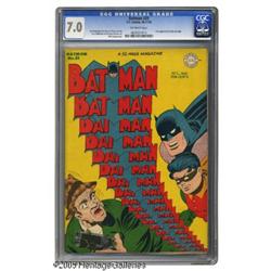 <B>Batman #31 (DC, 1945) CGC FN/VF 7.0 Off-white pages.</B></I> A complement of fine Bat-artists teamed up for this issue -- Dick Sprang delivered the optical effects on the cover, while Jerry Robinson and George Roussos pitched in with interior art. Overstreet 2004 FN 6.0 value = $336; VF 8.0 value = $700. CGC census 1/05: 5 in 7.0, 10 higher. <I>From the Northern Lights Collection.</B></I>