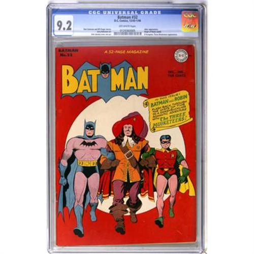 <B>Batman #32 (DC, 1945) CGC NM- 9.2 Off-white pages.</B></I> Dazzling copy, with color literally leaping from the cover. The origin of Robin is retold, the Joker makes an appearance, and famed Bat artist Dick Sprang brings the art, both on the cover and on the interior. Overstreet 2007 NM- 9.2 value = $1,625. CGC census 5/07: 2 in 9.2, 2 higher.<BR><BR><b>Shipping:</b> Comics - Slabbed (certified) (<a target="_blank" href="http://www.heritageauctions.com/common/shipping.php">view shipping information</a>)