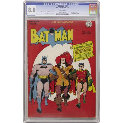 <B>Batman #32 (DC, 1945) CGC VF 8.0 White pages.</B></I> The Joker's back in this issue, and as usual he's casting about for a way to humiliate the Dynamic Duo. He's inspired by watching the masters of humiliation, fraternity brothers! Also in the issue: a time travel story, plus a recap of Robin's origin which deviates from previous accounts, stating that Robin was named after the robin redbreast rather than Robin Hood. The cover art is by Dick Sprang, as was the cover story, noted as a favorite of the artist. Overstreet 2006 VF 8.0 value = $719. CGC census 10/06: 2 in 8.0, 7 higher.<BR><BR><b>Shipping:</b> Slabbed Comic (<a target="_blank" href="http://www.heritageauctions.com/common/shipping.php">view shipping information</a>)