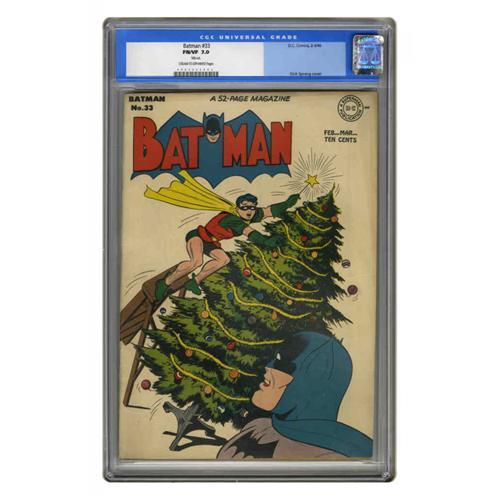 <B>Batman #33 (DC, 1946) CGC FN/VF 7.0 Cream to off-white pages.</B></I> Robin has a little trouble trimming the tree on this holiday-themed cover by Dick Sprang. Inside, Win Mortimer's handsome rendering of the Caped Crusader fills the pages, which include stories featuring the Penguin and the Jackal (who makes his first appearance here). CGC notes, "Mis-cut" -- this is only a slight imperfection on a still-attractive book. Overstreet 2005 FN 6.0 value = $369; VF 8.0 value = $769. CGC census 11/05: 6 in 7.0, 9 higher.
