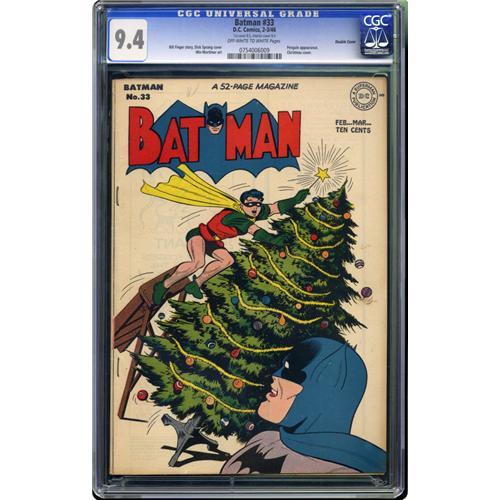 <B>Batman #33 Double Cover (DC, 1946) CGC NM 9.4 Off-white to white pages.</B></I> It'll be Christmas in May for this lot's winning bidder! And if you needed any additional reason to go after the highest-graded copy of this issue, the double cover should certainly seal the deal. Dick Sprang supplied the art for the Yuletide scene. Not everyone involved in the issue is in the spirit of giving, though -- take the Penguin, who's in the spirit of <I>stealing</B></I>, with only Batman and Robin to stand in his way. The interior art is by Win Mortimer. CGC notes, "1st cover 8.5, interior cover 9.4." Overstreet 2006 NM- 9.2 value = $1,750. CGC census 3/06: 1 in 9.4, none higher. <I>From the Collection of Harold Curtis.</B></I>