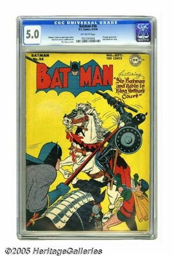 <B>Batman #36 (DC, 1946) CGC VG/FN 5.0 Off-white pages.</B></I> Penguin appearance. Last in the series of Alfred solo stories. Dick Sprang cover. Bob Kane and Jerry Robinson art. Overstreet 2005 VG 4.0 value = $228; FN 6.0 value = $342. CGC census 3/05: 2 in 5.0, 28 higher. <I>From the Northern Lights Collection.</B></I>
