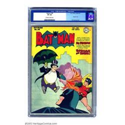 Batman #38 (DC, 1946) CGC VF 8.0 Off-white to white pages. Penguin appearances rank right behind Joker appearances in popularity, and cover appearances enhance the attraction even more. So, Batman fans, you should find this issue particularly winsome, with its Dick Sprang Penguin cover. But for a couple of small scuffs on the cover, this copy would rate even a higher grade. Overstreet 2002 VF 8.0 value = $694. Important notice: We expect to be auctioning lots at the rate of 200-250 per hour. Sometimes eBay Premier live bid software cannot keep up with that pace, so we strongly recommend that you place a realistic proxy bid now as insurance to avoid disappointment. Also please note that all Heritage/CAA lots purchased through eBay Premier carry a 20% Buyer's Premium. Please make sure you read the Terms and Conditions.