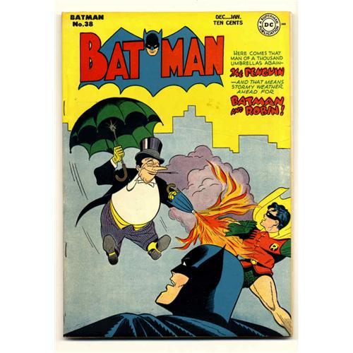 <B>Batman #38 (DC, 1946) Condition: VF-.</B></I> Here's a very nice-looking unslabbed copy that you can actually open up and read, and when you do, white pages await you! In the issue, the Penguin's out of the slammer and prepared to go straight... we've heard that one before! This time around, our favorite villain gets irked when a cartoon character named Peter Penguin becomes popular, and before you know it, the Fowl Felon is back to his villainous ways. This issue's also notable for having the first Batman art by Jim Mooney, who would draw the character many a time in years to come. Note that this copy could not be slabbed by CGC due to an overhang. Overstreet 2005 VF 8.0 value = $819.