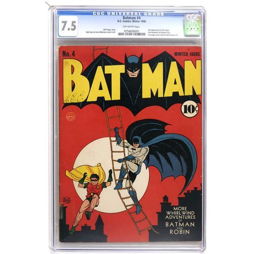 <B>Batman #4 (DC, 1940) CGC VF- 7.5 Off-white pages.</B></I> The black and red surfaces of this book's cover tend to be very unforgiving, and this copy exhibits only very minor color breaks, no wonder it's among the highest-graded copies yet certified. The issue has the first use of the term Gotham City, and the third appearance of that classic villain, the Joker. Bob Kane and Jerry Robinson teamed up on the art. Overstreet 2006 VF 8.0 value = $4,879. CGC census 7/06: 6 in 7.5, 4 higher. <BR><BR><B>Important notice:</B> Heritage usually auctions material at the rate of 200-250 lots per hour. On some occasions eBay Live bid software or the Internet may not be able to keep up with the pace of the auction. We recommend placing a realistic absentee bid now as insurance to avoid disappointment. Occasionally the auctioneer may eliminate or reject an eBay Live bid, and the auctioneer may also reopen a lot after the close of the eBay live bidding (usually because we missed an audience bid), and may reject your bid even if it shows you as the winning bidder. By bidding via eBay Live, you agree that Heritage may award the lot to another bidder at its sole discretion under the circumstances described above or any other reasonable circumstances. Since eBay bids are not shown to us until we open the lot on the floor, we treat those bids just like floor bids. In most cases the floor responds before the eBay bid is presented to us, due to Internet lag time, so for consistency we have made it a policy that floor bids are always considered first over tie eBay live bids. Also please note that all Heritage lots purchased through eBay Live carry a 22.5% Buyer's Premium. Please make sure you read the Terms and Conditions before you bid. This lot is being auctioned in conjunction with a live floor auction by Heritage Auction Galleries. All final auction and invoice information will be supplied by Heritage Auction Galleries, and all other information should be considered preliminary. Lot:41001 <BR><BR><B>Winning Notification and Billing:</B> After the FINAL session in this auction is complete, Heritage will send e-mail and snail mail invoices. This process normally takes several days. All final auction and invoice information will be supplied by Heritage Auction Galleries, and all other information should be considered preliminary. <BR><BR>This auction will be conducted on a live auction floor and over the Internet through eBay Live. If you choose to place an absentee bid, please take a moment to <font color='#0000ff'><u><a href='http://pages.ebay.com/liveauctions/help/before/laabsentee.html'>learn how eBay Live absentee bidding works</a></u></font><font color='#000000'>