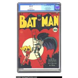 Batman #4 (DC, 1940) CGC VG+ 4.5 Off-white pages. This nice, tight copy features the third appearance of the Joker and the first mention of Gotham City. Early issues of Batman are highly sought after and are a prized part of Golden Age collections. This affordable copy presents a great opportunity to add a very early appearance of Batman to your collection. Overstreet 2002 GD 2.0 value = $630; VG 4.0 value = $1,890. Important notice: We expect to be auctioning lots at the rate of 200-250 per hour. Sometimes eBay Premier live bid software cannot keep up with that pace, so we strongly recommend that you place a realistic proxy bid now as insurance to avoid disappointment. Also please note that all Heritage/CAA lots purchased through eBay Premier carry a 20% Buyer's Premium. Please make sure you read the Terms and Conditions.