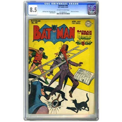 <B>Batman #40 (DC, 1947) CGC VF+ 8.5 Off-white to white pages.</B></I> A run of bad luck causes the Joker to lose his trademark grin on this issue's Jack Burnley cover! Inside, the three Batman stories drawn by fan-favorite Dick Sprang should bring a smile to your face. Other than a little mellowing with age, this sharp-looking copy has retained much of its original newsstand freshness. Overstreet 2006 VF 8.0 value = $975; VF/NM 9.0 value = $1,538. CGC census 3/06: 5 in 8.5, 8 higher.