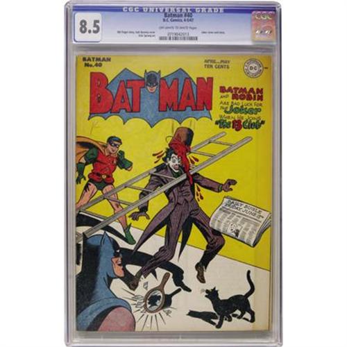 <B>Batman #40 (DC, 1947) CGC VF+ 8.5 Off-white to white pages.</B></I> The Joker is the subject of a few pranks, courtesy of the Dynamic Duo, on this Jack Burnley cover. The ever-popular Dick Sprang handles art chores inside. We're not joking when we say this copy is extra sharp! Overstreet 2007 VF 8.0 value = $1,006; VF/NM 9.0 value = $1,628. CGC census 6/07: 5 in 8.5, 8 higher.<BR><BR><b>Shipping:</b> Comics - Slabbed (certified) (<a target="_blank" href="http://www.heritageauctions.com/common/shipping.php">view shipping information</a>)