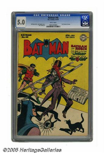 <B>Batman #40 (DC, 1947) CGC VG/FN 5.0 White pages.</B></I> Joker appearance. Jack Burnley cover. Dick Sprang art. Overstreet 2005 VG 4.0 value = $308; FN 6.0 value = $462. <I>From the Northern Lights collection.</B></I>